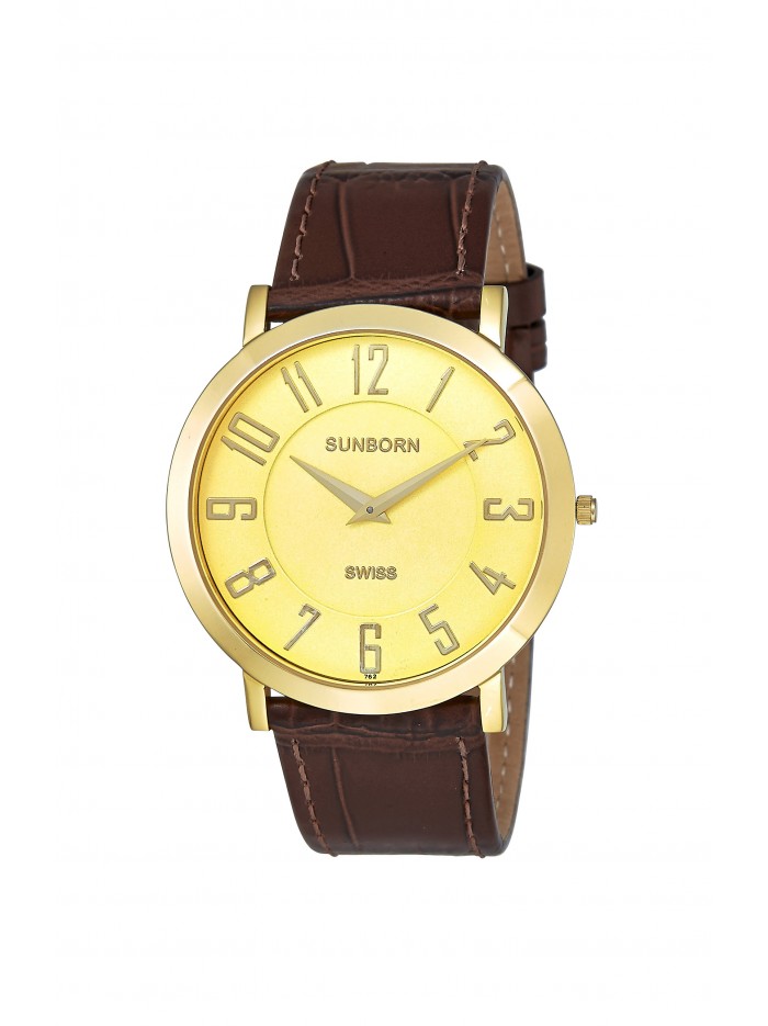 Men's stainless steel watch in gold tone case with Arabic numerals on gold tone dial and genuine dark brown leather strap