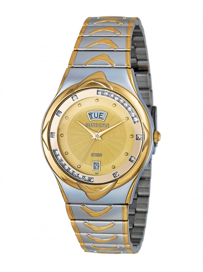 Men's 2-tone stainless steel watch with Swarovski crystal accent on bezel, day and date calendar on champagne dial