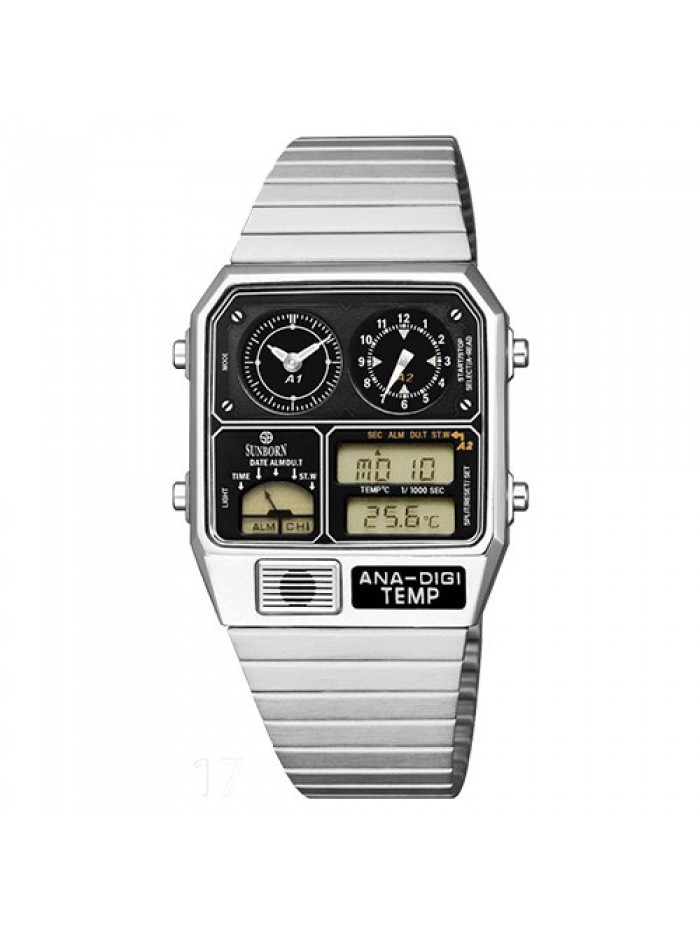This watch has a square-shaped dial with stainless case and gold plating surface treatment that completes its look. With the free type band, this watch provides ease of wearing. Other features included are temp display, date day display, quick date correction function, 12/24 hour display switching function, 1/100 second chronograph, dual time function, battery life expiration notice function and thermometer function.