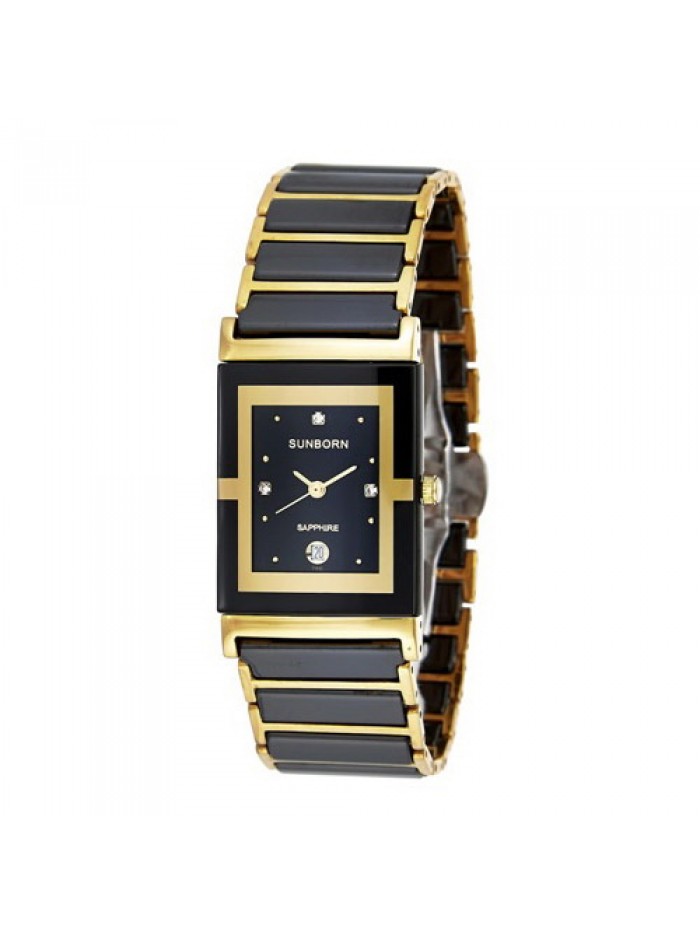 Men's black ceramic, 2-tone watch with stainless steel case,Swarovski crystal hour markers on black dial, date window at 6 o'clock marker