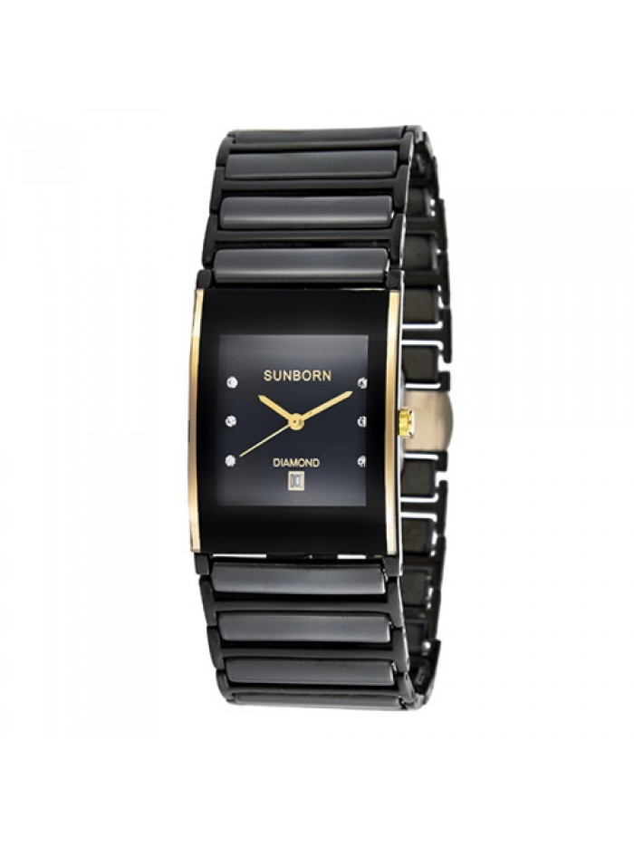 Men's black ceramic watch with stainless steel case with Swarovski crystals on black dial