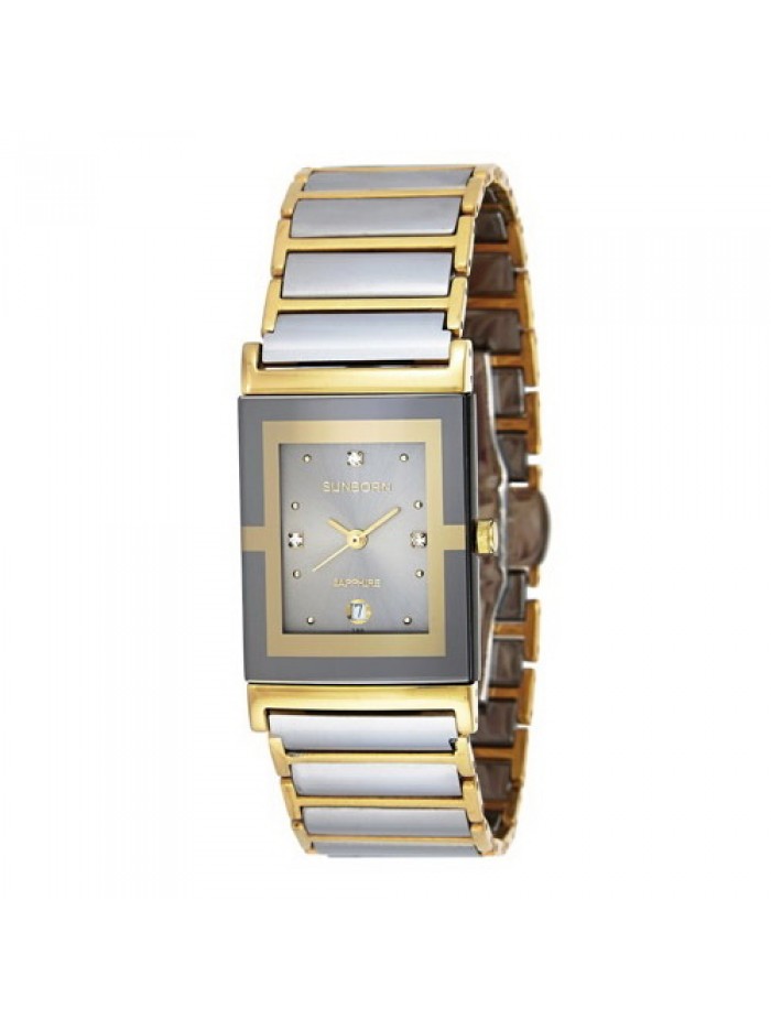 Men's 2-tone tungsten watch with stainless steel case,Swarovski crystal hour markers on grey dial, date window at 6 o'clock marker