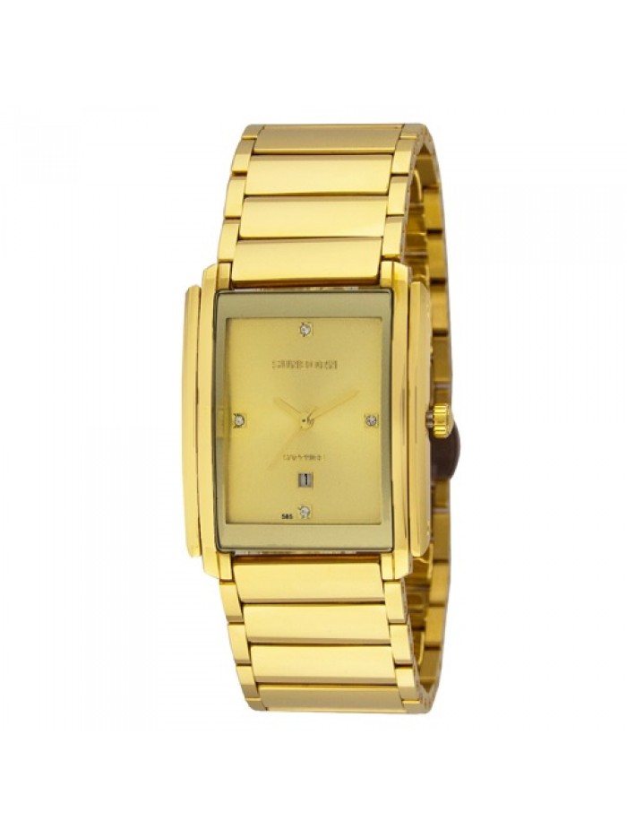 Men's tungsten watch with stainless steel case, crystal hour marker and date window on gold tone dial