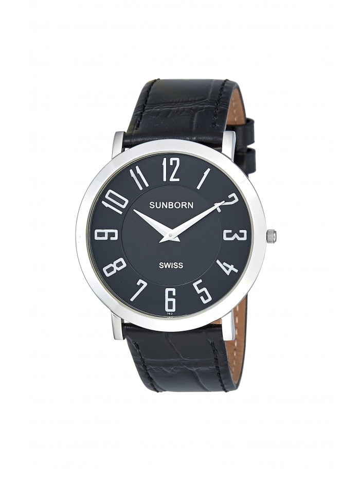 Men's stainless steel case watch with Arabic numerals in black dial and genuine black leather strap