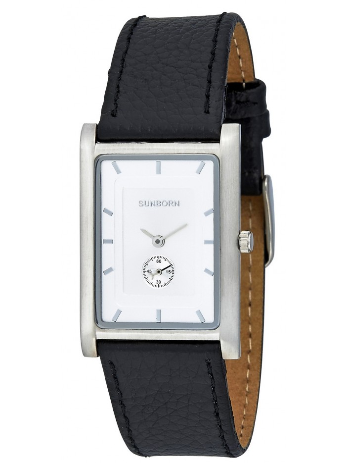 Men's stainless steel watch in gold tone with small second hand on black dial and black leather strap