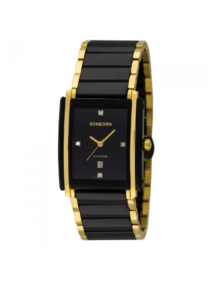Men's black 2-tone ceramic watch, stainless steel in gold tone, crystal hour markers and date window on black dial