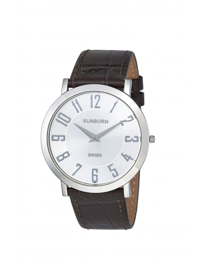 Men's stainless steel case watch with Arabic numerals in silver tone and genuine dark brown leather strap