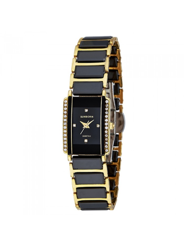 Ladies 2-tone black ceramic watch with stainless steel case, Swarovski crystal on black dial and bezel