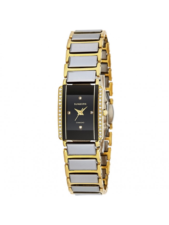 Ladies 2-tone tungsten watch with stainless steel case, Swarovski crystal on black dial and bezel