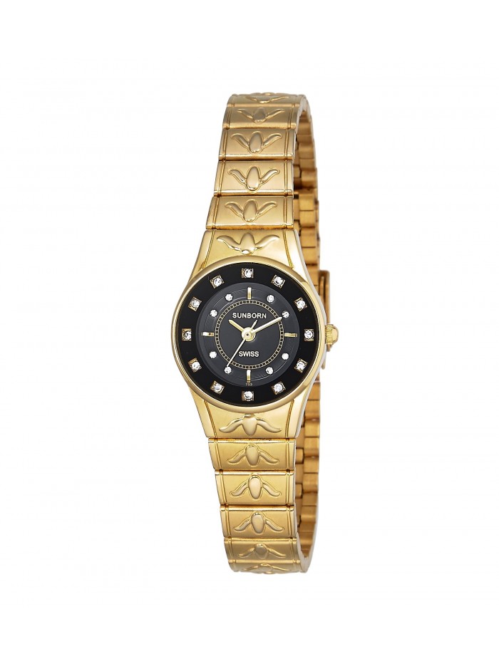 Ladies gold tone stainless steel watch with Swarovski crystal accent on bezel and black dial
