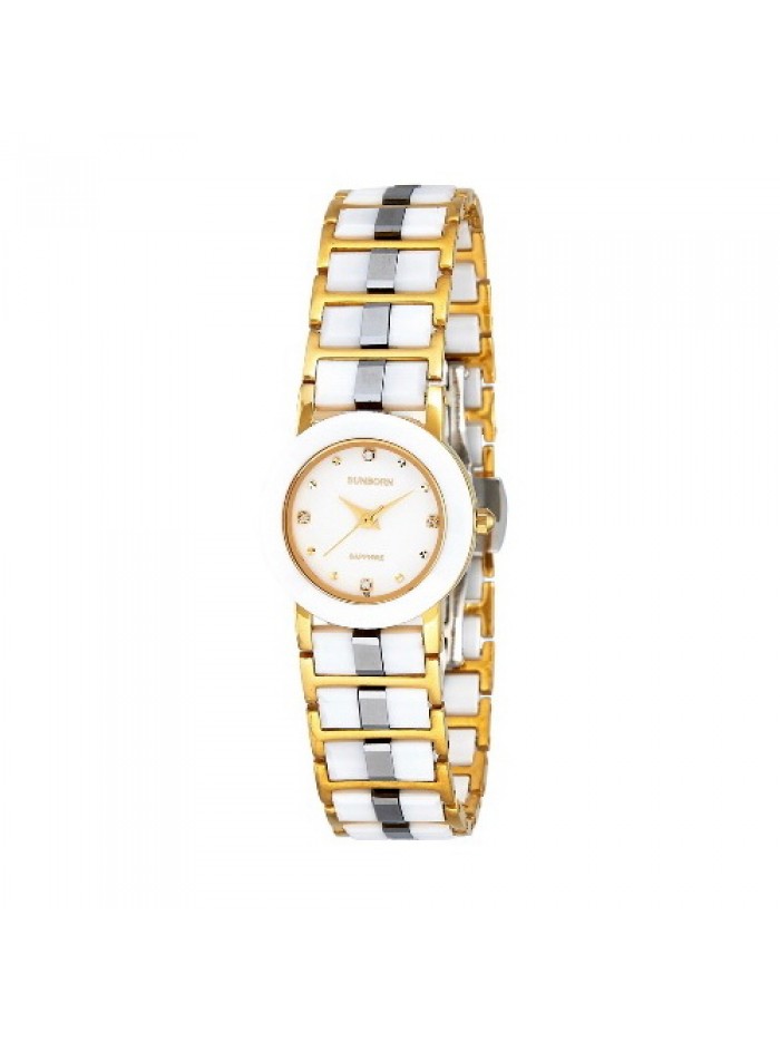 Ladies white ceramic and gold tone watch with crystal hour markers on white dial, scratch free Sapphire crystal