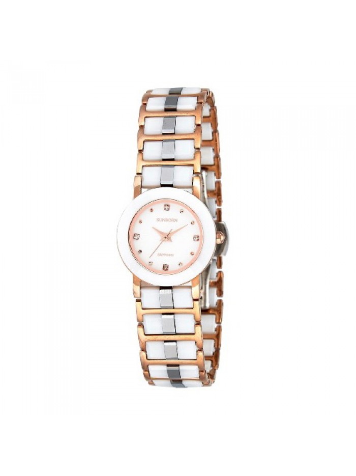 Ladies white ceramic and rose gold tone watch with crystal hour markers on white dial, scratch free Sapphire crystal