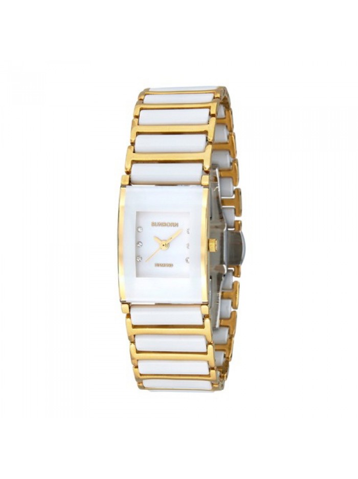 Ladies white ceramic 2-tone watch with stainless steel case and Swarovski crystal markers on white dial