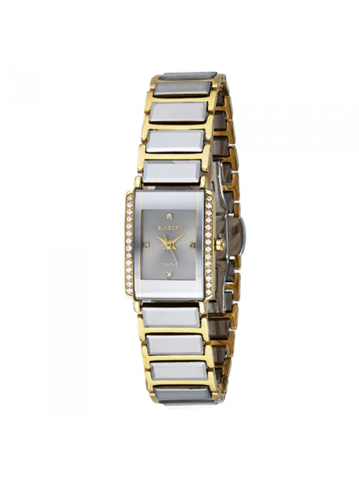Ladies 2-tone tungsten watch with stainless steel case, Swarovski crystal on silver dial and bezel