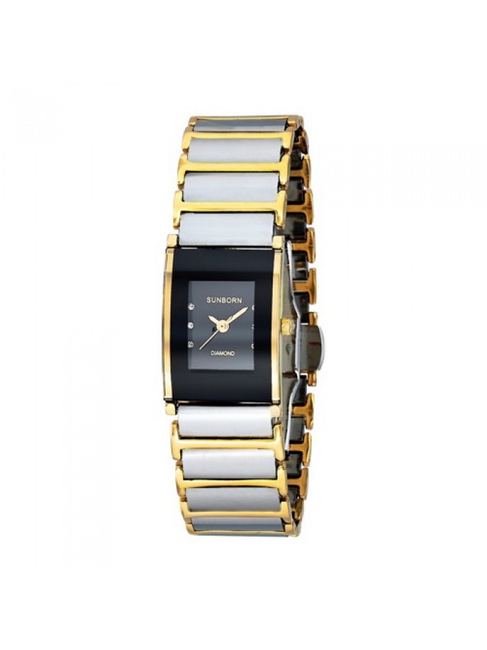 Ladies 2-tone tungsten watch with stainless steel case and Swarovski crystal markers on black dial