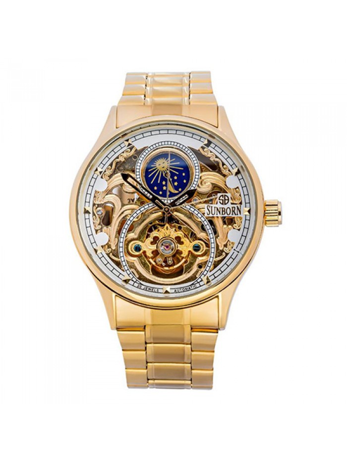 Men's stainless steel watch in gold tone with day and date calendar on gold tone dial
