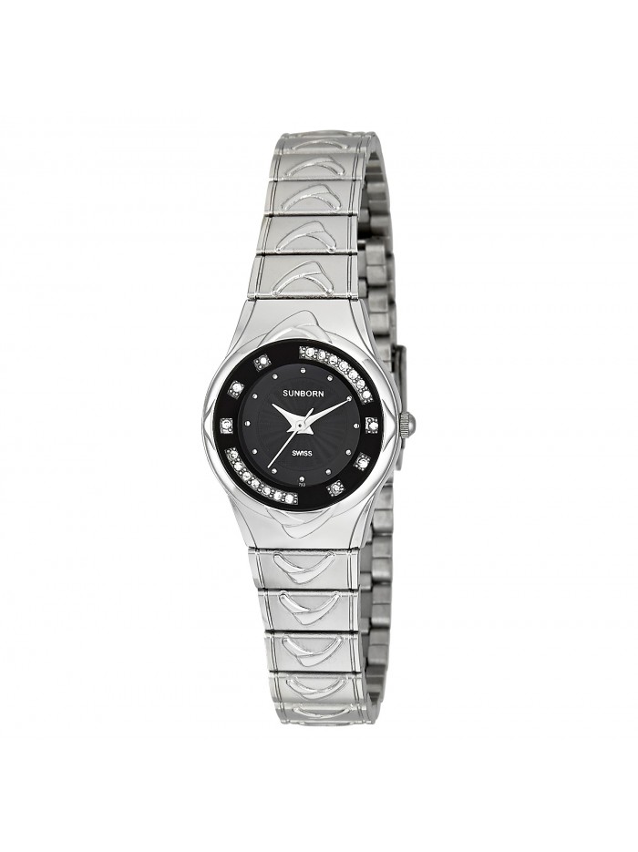 Ladies stainless steel watch with Swarovski crystal accent on bezel, black dial