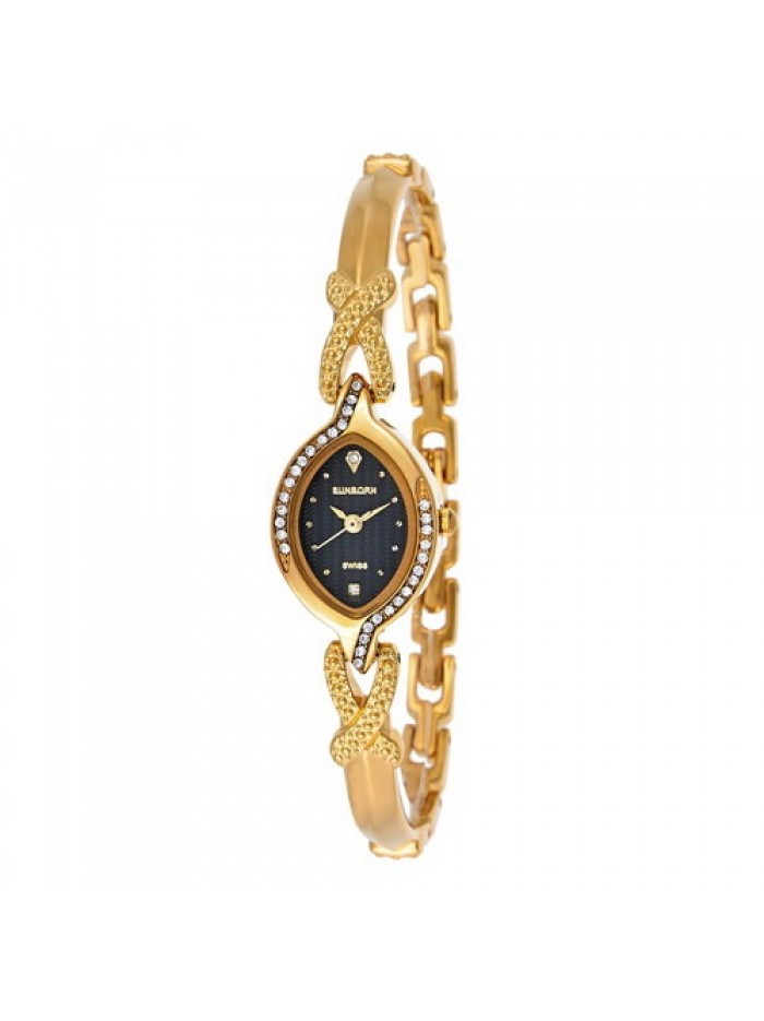 Ladies fashion bracelet watch in gold tone with crystals on bezel, black dial