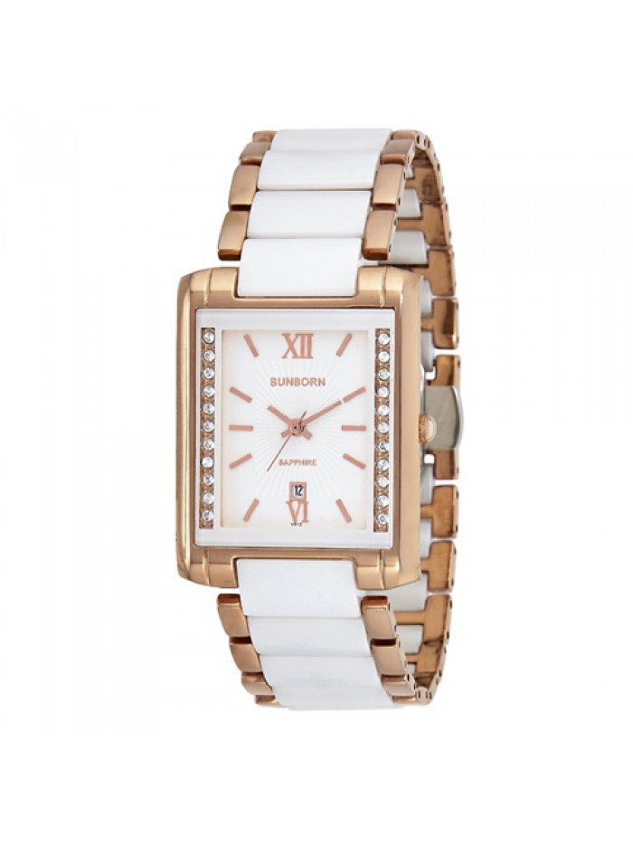 Men's white ceramic with rose gold tone stainless steel case with Swarovski crystals on white dial, date window at 6 o'clock marker