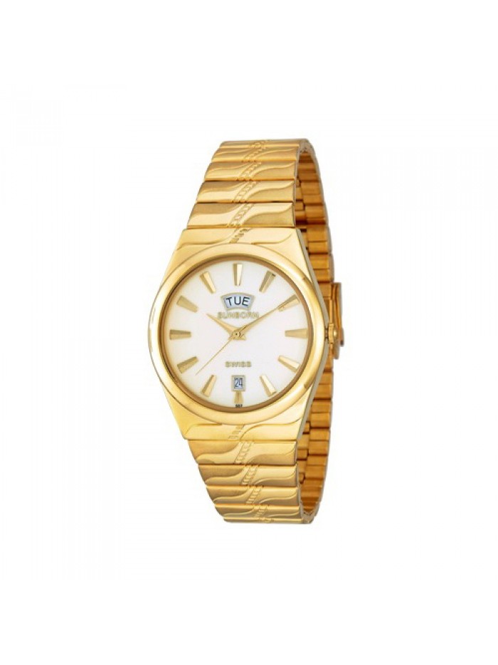 Men's stainless steel watch in gold tone with day and date calendar on champagne dial