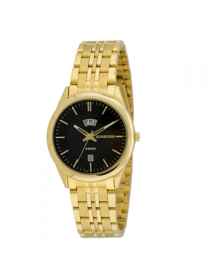 Men's round stainless steel watch in gold tone with day and date calendar on black dial