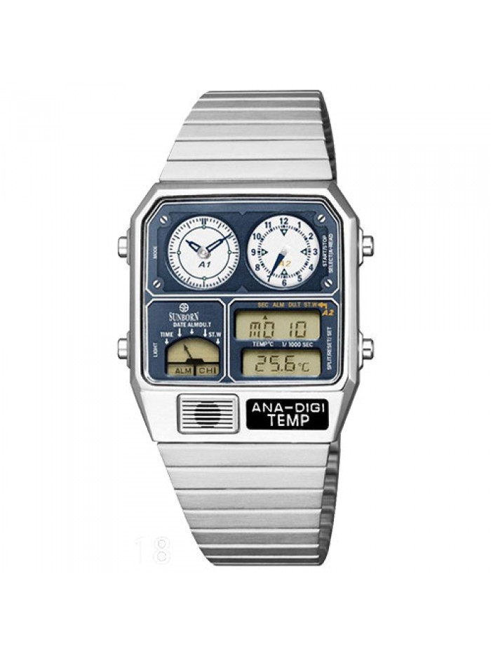 This watch has a square-shaped dial with stainless case and gold plating surface treatment that completes its look. With the free type band, this watch provides ease of wearing. Other features included are temp display, date day display, quick date correction function, 12/24 hour display switching function, 1/100 second chronograph, dual time function, battery life expiration notice function and thermometer function.