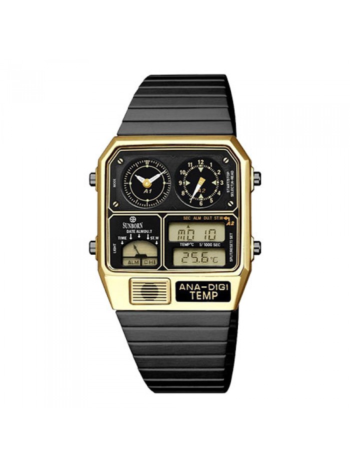 This watch has a square-shaped dial with stainless case and gold plating surface treatment that completes its look. With the free type band, this watch provides ease of wearing. Other features included are temp display, date day display, quick date correction function, 12/24 hour display switching function, 1/100 second chronograph, dual time function, battery life expiration notice function and thermometer function.